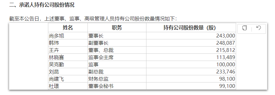 期间,公司消息不断。11月2日,公司公告,收到公司董事、监事及高管全体持股人员出具的《关于两年内不减持公司股份的承诺》,包括董事长尚多旭、副董事长韩玮、董事兼总裁王卉、监事会主席林晓赛、监事吴克勤、副总裁刘昆、财务总监尚建飞、董事会秘书杜璟。