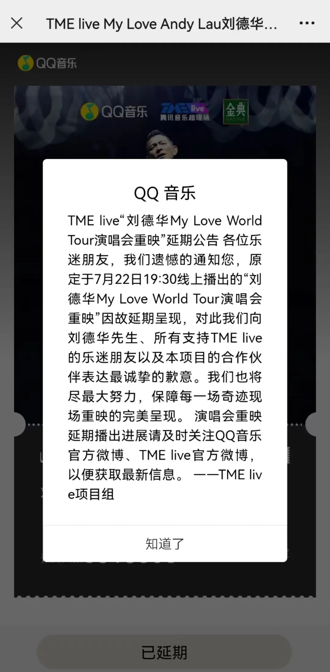 腾讯音乐最早于今年7月便放出了刘德华演唱会的预约观看链接,但在演唱会原定上线日期当日,腾讯音乐宣布演唱会因故延期。时隔近四个月后,这场重映演唱会终于在线上播出。