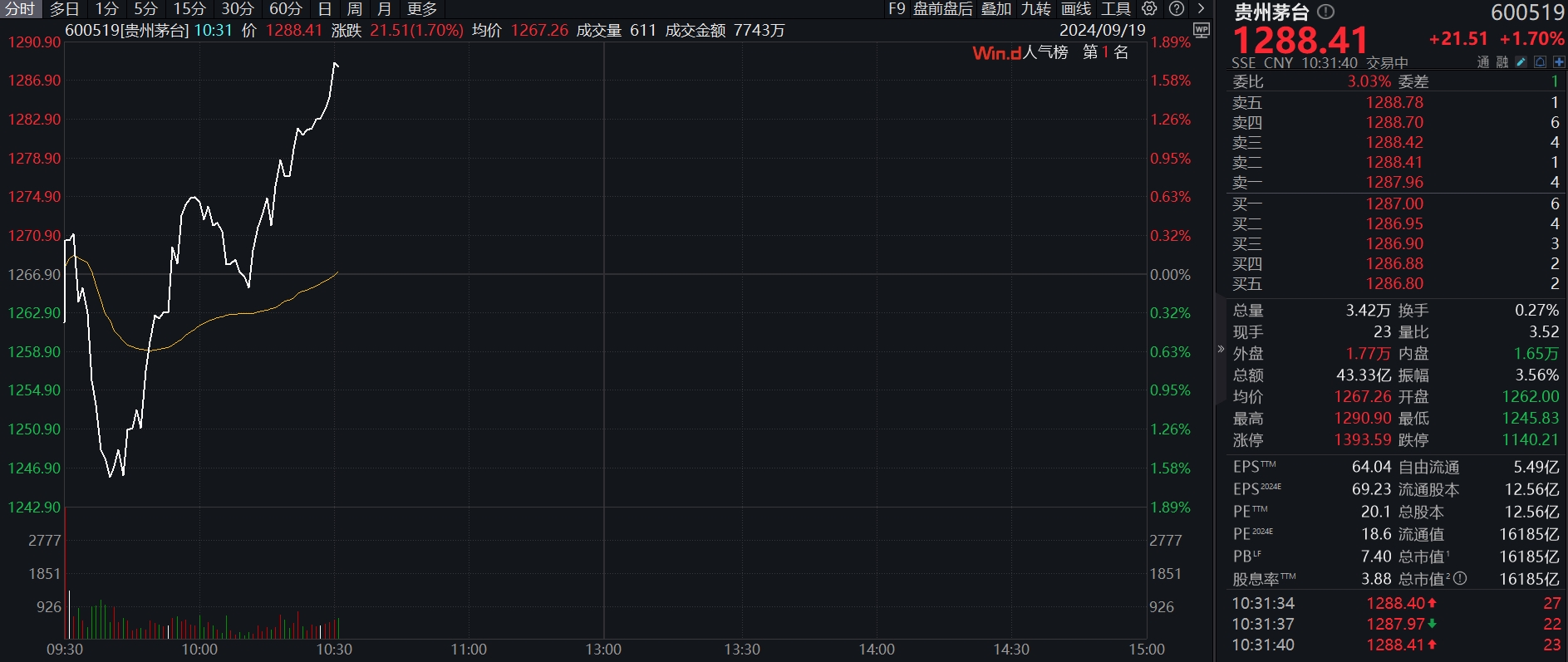早盘,贵州茅台一度跳水跌破1250关口,创2020年5月以来新低。随着白酒股的集体反弹,贵州茅台股价突然拉升翻红,截至发稿,股价涨超1%,报1288.41元,振幅3.56%。昨日,该股股价跌破1300元大关。