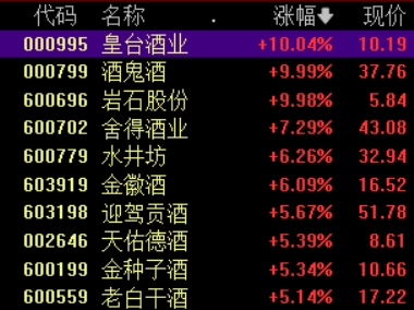 9月19日,白酒股盘中集体迎来大反弹。截至发稿,皇台酒业、酒鬼酒、岩石股份涨停,舍得酒业涨逾7%,水井坊、金徽酒涨6%,金种子酒、老白干酒等跟涨,板块个股全线飘红。