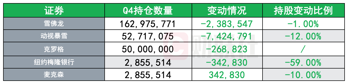 (伯克希尔Q4前五大减仓股,来源:Whalewisdom、财联社)