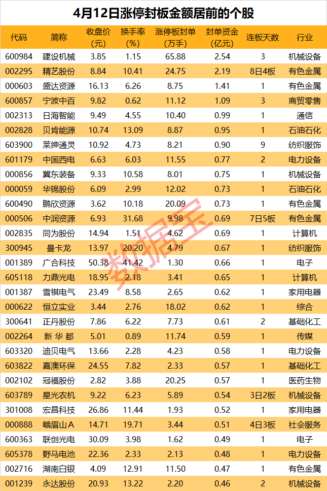 以封单金额计算,4股封单金额超亿元,建设机械、精艺股份、盛达资源封单金额居前,分别为2.54亿元、2.19亿元、1.41亿元。