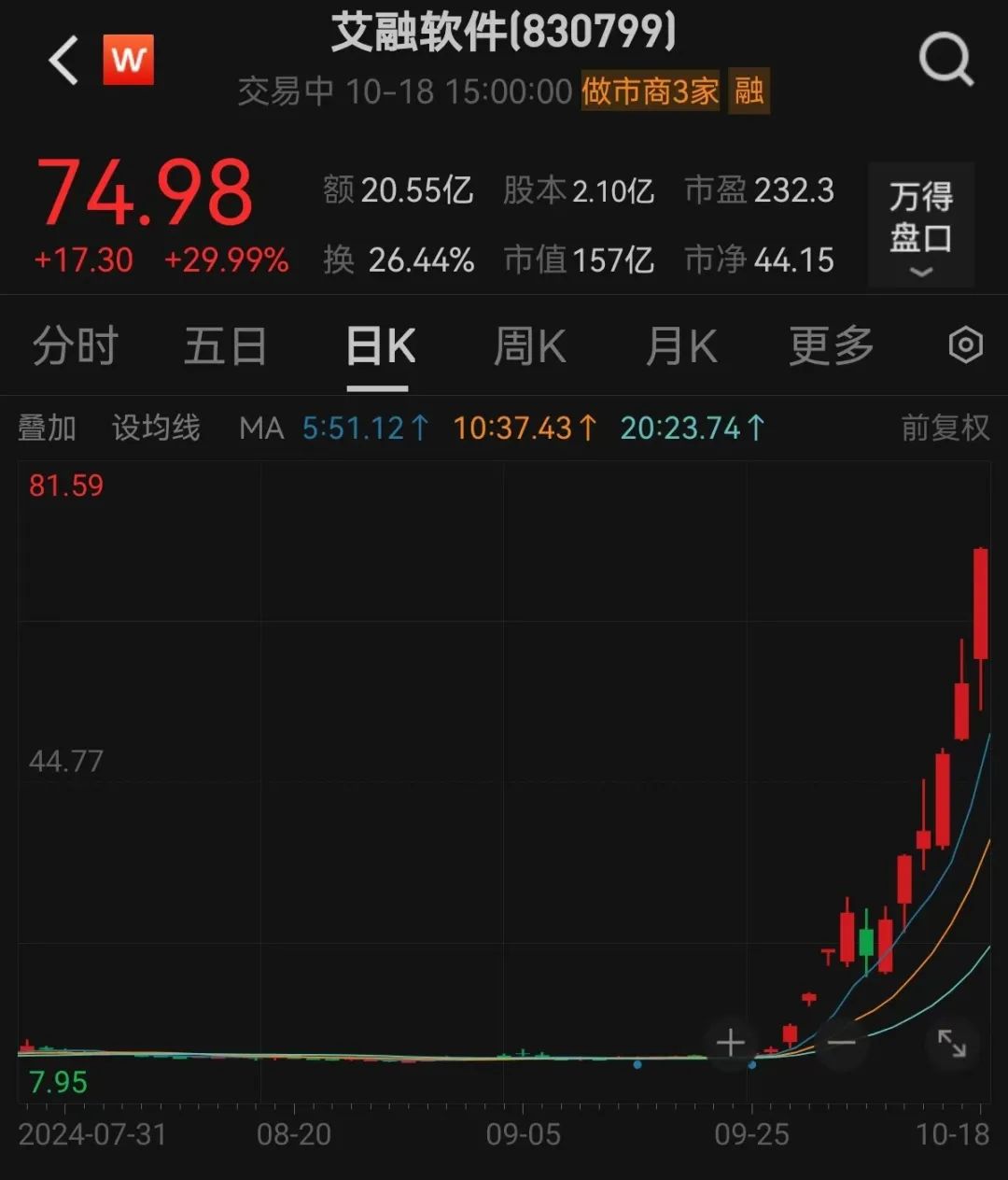 资料显示,艾融软件是一家向以大型银行为代表的金融行业客户提供人工智能、虚拟现实技术为主的信创解决方案的新型高科技企业,今年上半年公司总营收2.75亿元,净利润为0.21亿元。截至10月18日收盘,该股市盈率为232.27倍,市净率为44.15倍。