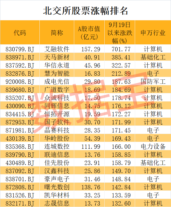 盘后数据显示,北交所股票总成交额达到333.82亿元,创历史新高。10月18日,16只北交所股票30cm涨停。艾融软件无疑是其中最亮眼的1只,该股自9月19日以来累计涨幅达到7.02倍,排名A股同期第一位,成为本轮行情以来的最大黑马。