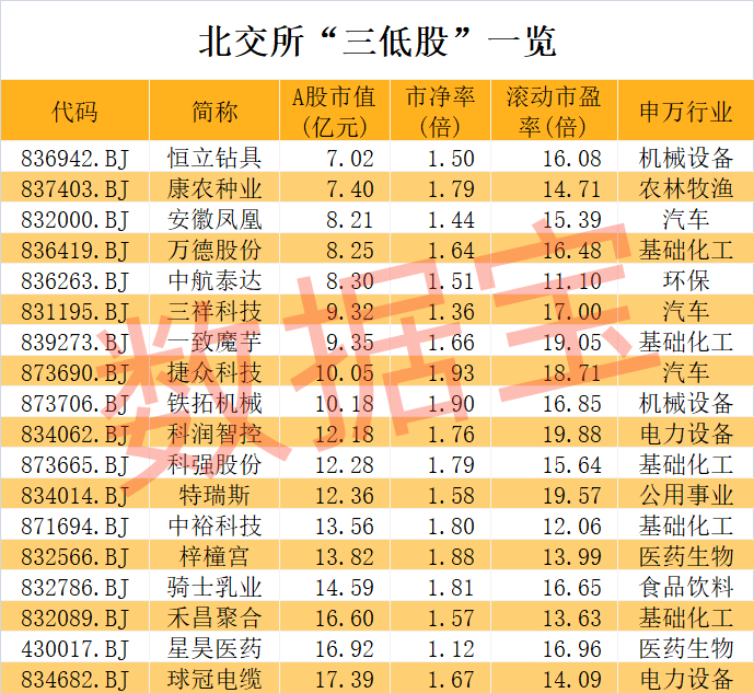 市盈率和市净率是衡量上市公司投资价值的参考因素之一。据数据宝统计,截至10月18日,市净率低于2倍,且滚动市盈率低于20倍,同时A股市值低于20亿元的北交所股票有18只,其中恒立钻具、康农种业、安徽凤凰、万德股份、中航泰达、三祥科技、一致魔芋A股市值不到10亿元。