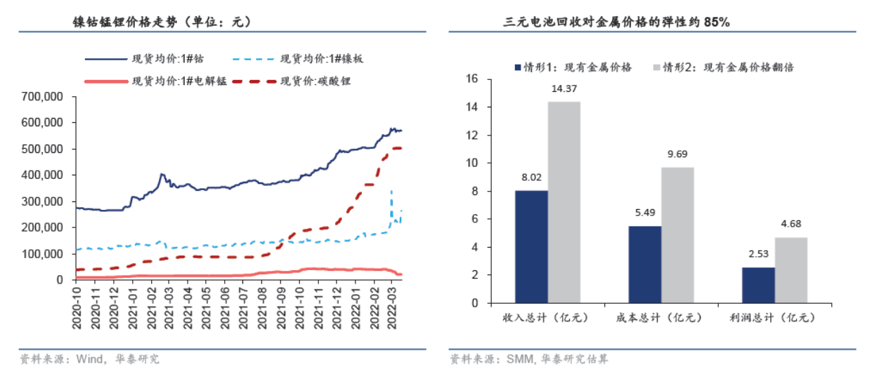 金属价格从2020年末进入上升通道,带动回收产业盈利性增强。受锂电池正极材料需求驱动,上游金属普遍出现较大涨幅。2022年3月底,金属钴价达到57万元/吨,镍价达23万元/吨,锰价格达到2万元/吨,碳酸锂价格达到50万元/吨,同比均有大幅增长。锂电池金属的高价给予回收产品更高附加值。