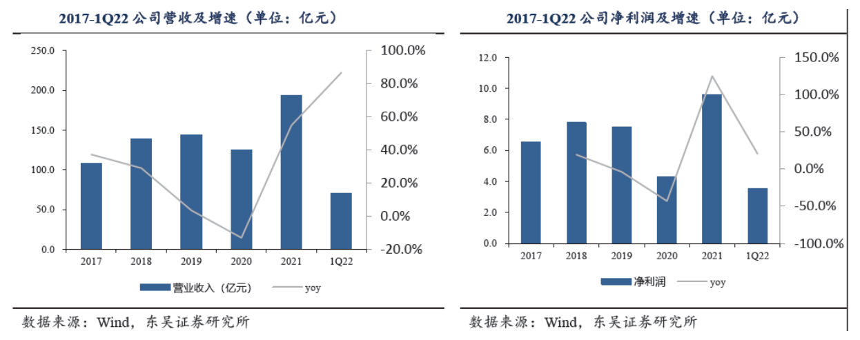 公司21年实现营收193亿元,同增55%,净利实现翻番。新能源行业的高速发展助力公司2021年实现营业收入193.01亿元,同比增长54.83%。同年实现归属于母公司净利润9.23亿元,同比增长123.8%;扣非后盈利7.22亿元,同比增长106.0%。1Q22公司营收增长迅猛,实现营收69.7亿元,较去21年同期增长86.78%,同时实现净利3.51亿元,同比增长20.4%。2017-2021年公司实现复合增速30%+。