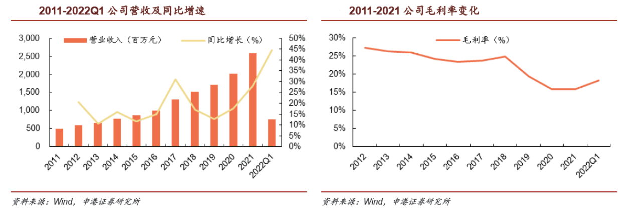 公司近10年营收稳步增长,2016-2021年CAGR达21%。2021年公司营收同比增长28.1%;2022年Q1,受益于锂电池业务产能逐步释放及磷酸铁锂等正极材料原料价格大幅上涨,公司营收同比高增44.6%,同时毛利率也回升至18%。