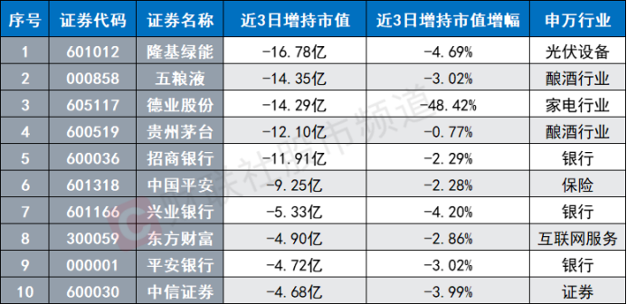 具体个股来看,同样以近3日数据统计,累计共有69股遭北向减持超1亿元,其中,光伏龙头股隆基绿能的减持规模位居首位,达16.78亿元。据悉,本月以来,隆基绿能的北向持股市值持续下降,截至5月25日,其持股市值月内合计下降近60亿元,股价也累计跌近10%。此外,五粮液、德业股份、贵州茅台、招商银行近3日减持规模也均在10亿元以上。