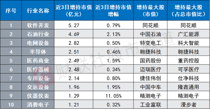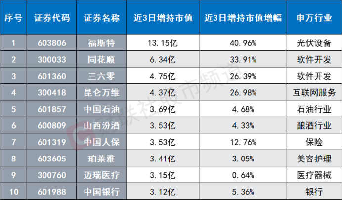 虽然北向资金近日重点减持酿酒、银行、家电等多个板块,不过其对部分方向仍逆市加仓。从数据上看,软件开发、石油行业、电网设备、半导体、医药商业近3日获北向重点加仓。此外,从具体个股来看,累计共有10只个股获北向资金3亿元以上加仓,其中,福斯特、同花顺、三六零、昆仑万维、中国石油等股增持居前。