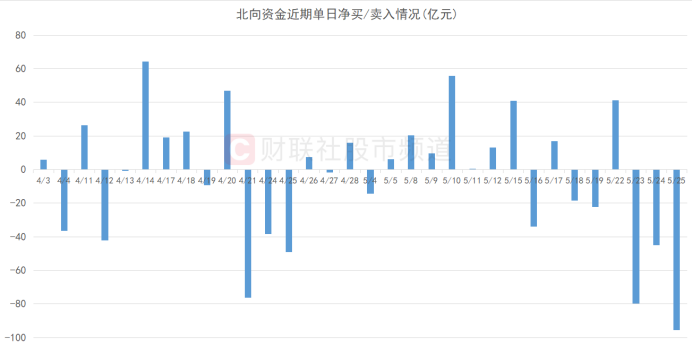 本周(5月22日至26日),北向资金呈现流出态势,4个交易日期间(5月26日休市)累计净卖出近16.9亿元,其中,5月25日单日净卖出近95.6亿元,刷新近7个月以来单日记录,且近3日(5月23日至25日)合计净卖出近220亿元。