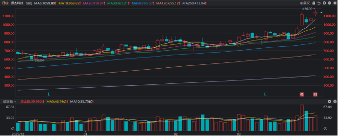 目前,市场聚焦于源杰科技能否接过寒武纪的接力棒,成为下一个超越贵州茅台的“股王”。不过,当前回落至第三位的寒武纪近期人气再聚,在3月23日股价短暂跌破千元后,其于次日(3月24日)重返千元关口,当日涨幅达5.89%,截至今日收盘,其目前股价回升至1039元,距离源杰科技仅相差10个百分点。