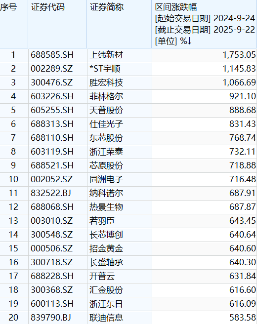 数据显示,2024年9月24日-2025年9月22日(下称“期间”),全市场共计1508只股股价翻倍,仅从概率而言,在每三只股票中选一只并持有至今,只要运气别太差,都有概率股价翻倍。