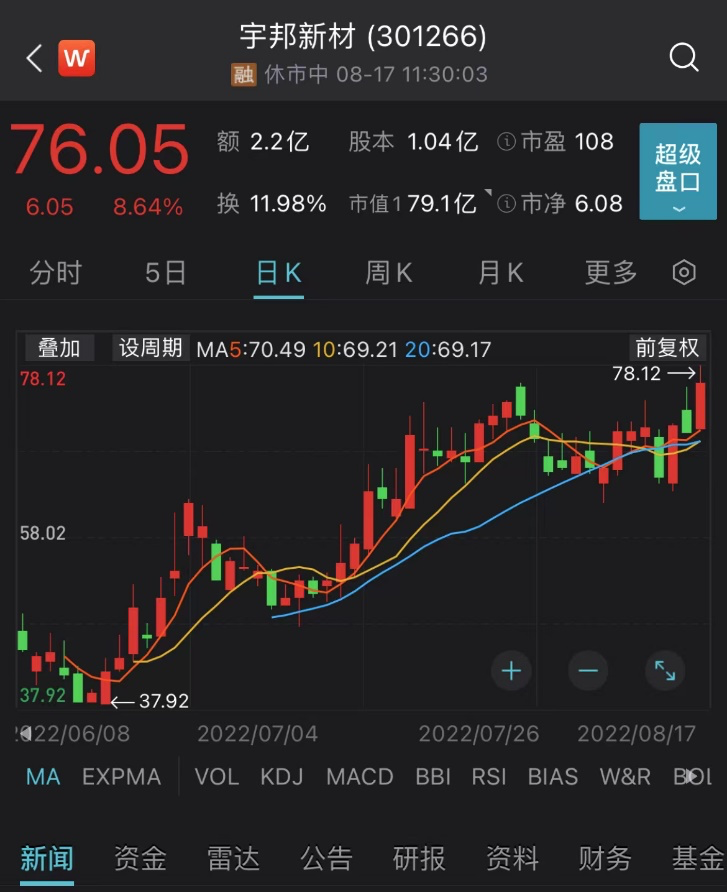 另一只光伏赛道股宇邦新材上涨8.64%,盘中股价创历史新高,公司产品光伏焊带是光伏组件的重要组成部分。