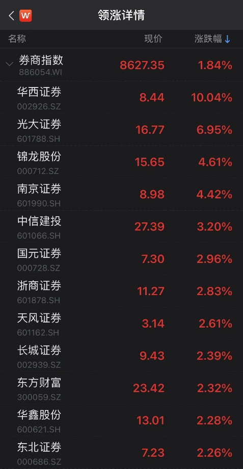 今日上午,券商板块再度拉升,华西证券涨停,光大证券涨6.95%。