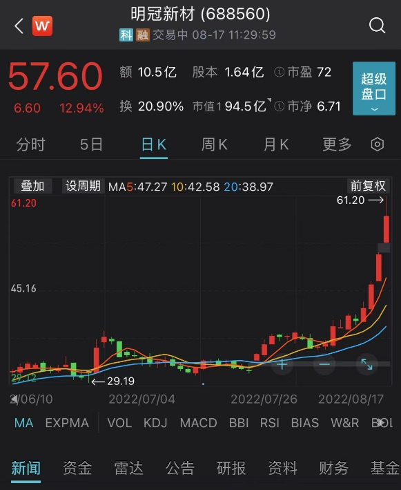凭借光伏胶膜的风口,近期明冠新材连续大涨,17日上午,股价涨12.94%,近4个交易日累计涨幅达44.72%。