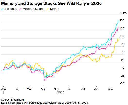 生产计算机硬盘驱动器(HDD)的希捷科技,今年以来股价飙升156%,一举成为标普500指数中表现最佳的个股。其竞争对手西部数据紧随其后,以137%的涨幅位列第三。而美国最大的内存芯片制造商美光科技(MU.US),在创下连续12个交易日上涨的纪录后,2025年以来的股价涨幅已达93%,跻身该指数涨幅前五名。