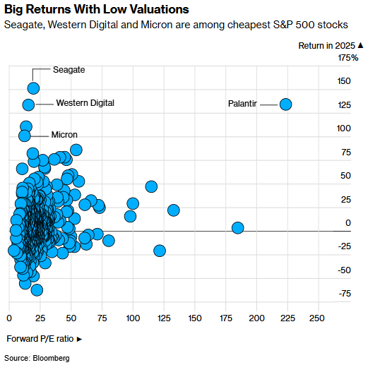 2025年初,西部数据的预期市盈率(股价与预估利润比)不足6倍,希捷和美光也仅约10倍。尽管此后估值有所攀升,但三者当前的市盈率仍低于标普500指数(未来12个月预期市盈率为23倍)。