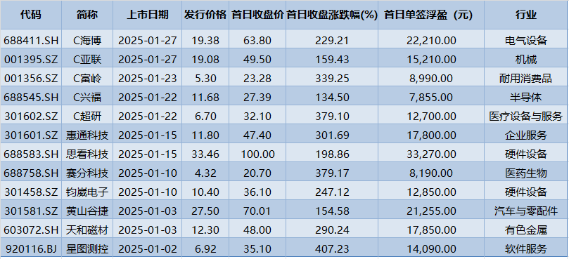 新股生态正发生新的变化,发行节奏持续处于低位。随着新股上市频率下降,加之A股市场整体转暖,新股市场人气较高。从上市表现来看,今年的新股上市首日平均涨幅翻倍。按收盘价计算,1月12只新股有三只新股首日打新收益站在了2万元以上。其中,单签收益最高的是思看科技。
