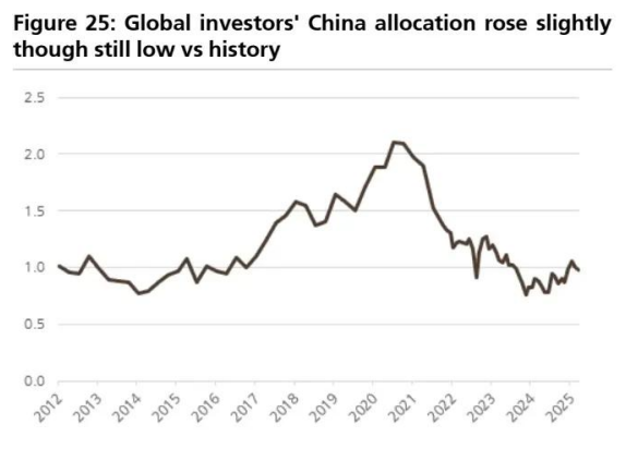 图 25:全球投资者对中国的配置略有上升,但仍低于历史水平