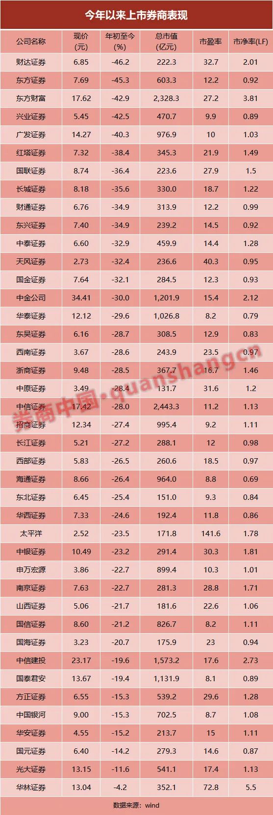 据Wind统计,41家上市券商今年以来整体下跌,跌幅居前三的为财达证券、东方证券和东方财富,年初至今分别下跌46.2%、45.3%和42.9%,跌幅最小的为华林证券,年初至今下跌4.2%。