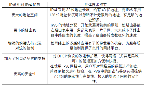 随着IPv4的地址耗尽、服务质量难以保证,IPv6的出现和普及可以有效缓解和解决以上问题。IPv6具有更大的地址空间、更小的路由表、增强的组播支持以及对流的控制、加入了对自动配置的支持、更高的安全性等优势。