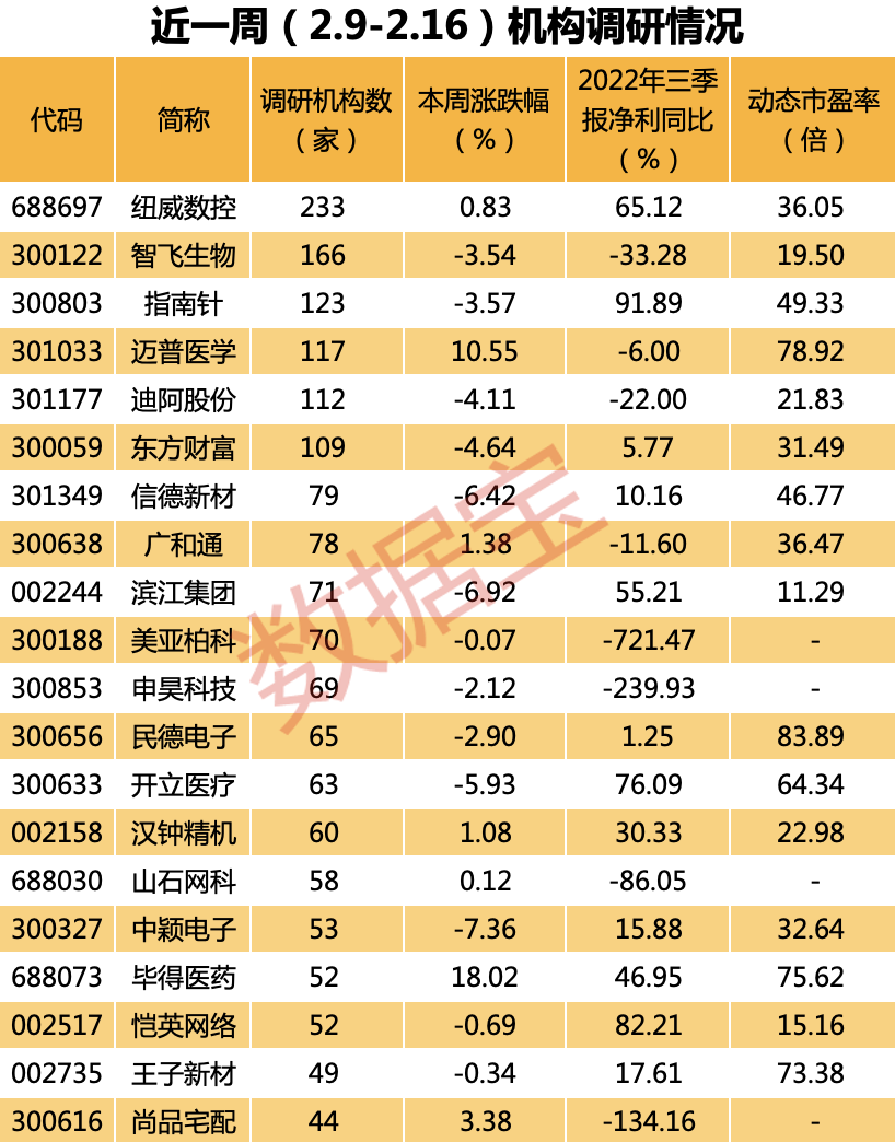 另外,智飞生物、指南针、迈普医学、迪阿股份等均有超百家机构调研,信德新材、广和通、滨江集团等有50家以上机构调研。