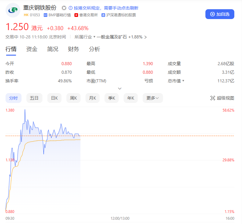 港股大幅波动股中,重庆钢铁股份大涨,盘中涨幅一度接近60%。截至发稿,该股涨超40%。