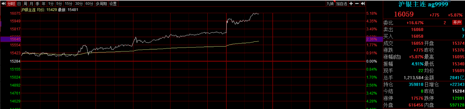 09:50沪银期货主力合约涨超5%,突破16000元/千克关口,续创历史新高。