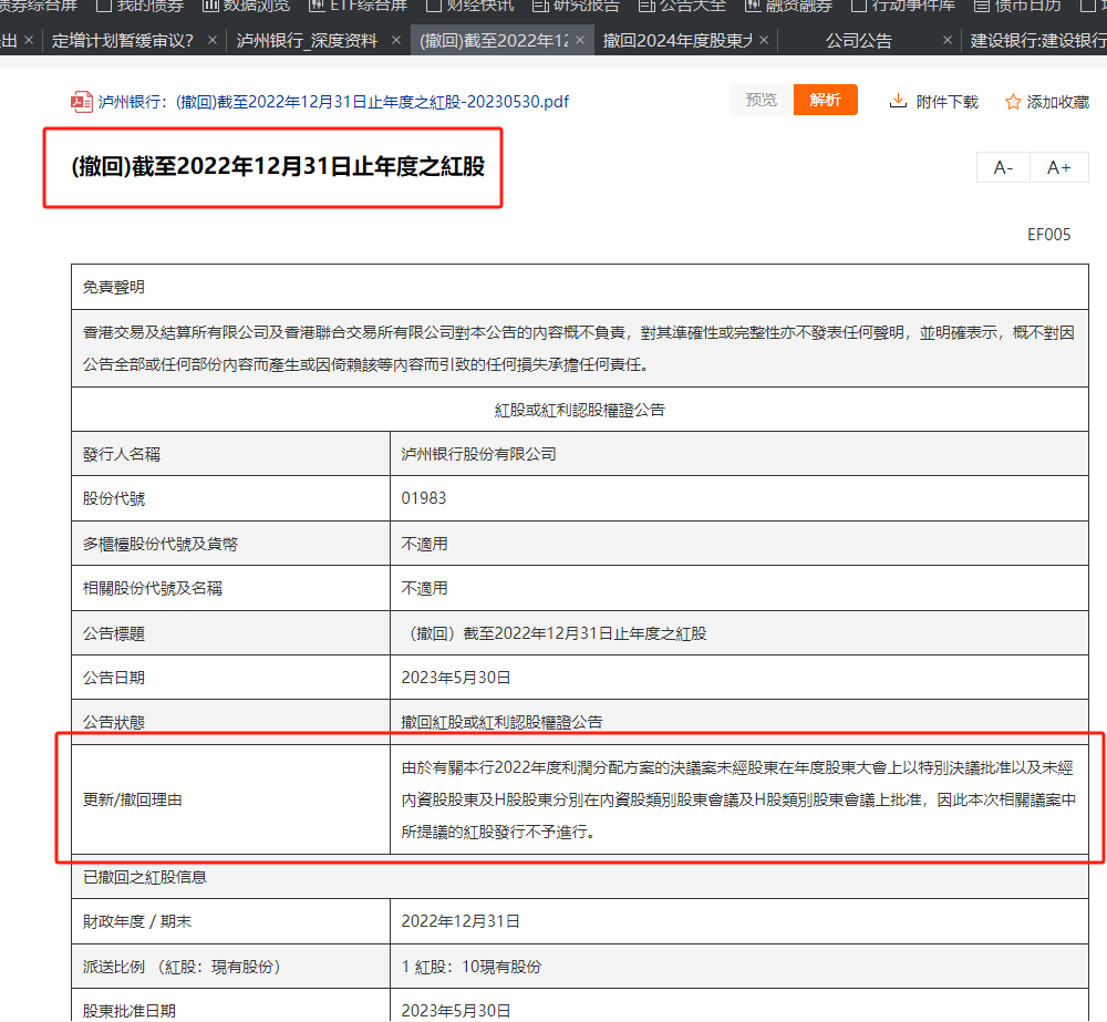 泸州银行称,其撤回其已发布的《截止2022年12月31日止年度之红股》的公告的理由为:“由于有关本行2022年度利润分配方案的决议案未经股东在年度股东大会上以特别决议批准,以及未经内资股股东及H股股东分别在内资股类别股东会议及H股类别股东会议上批准,因此本次相关议案中所提议的红股发行不予进行。”