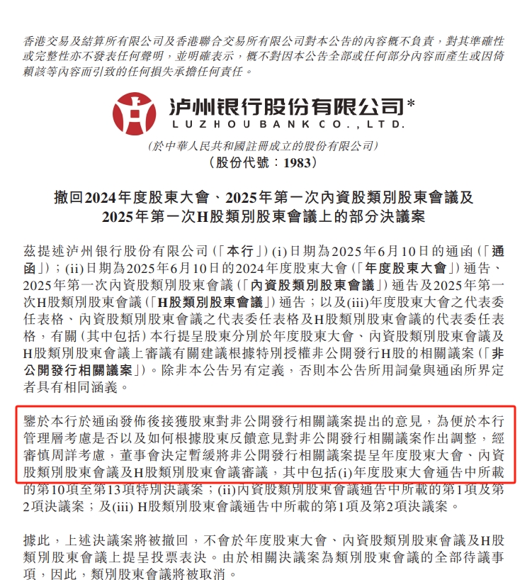 6月25日晚,泸州银行公告,鉴于本行于通函发布后接获股东对非公开发行相关议案提出的意见,为便于本行管理层考虑是否以及如何根据股东反馈意见对非公开发行相关议案作出调整,经审慎周详考虑,董事会决定暂缓将非公开发行相关议案提呈年度股东大会、内资股类别股东会议及H股类别股东会议审议。
