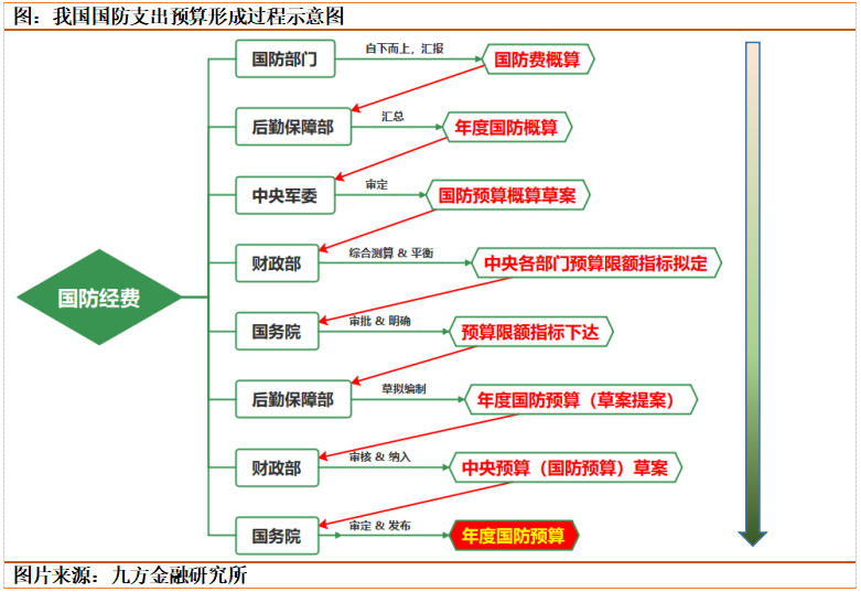 从流程来看,我国的国防支出预算敲定需要经过一系列严谨且繁复的过程。除部队机关与产研单位等众多具体国防部门以外,年度国防预算的拟定、(反复)审核到最终敲定大致需要经过4个部门之间反复来回的7道“工序”;