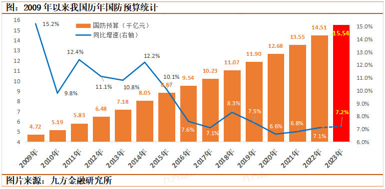 3月5日,全国两会《关于2022年中央和地方预算执行情况与2023年中央和地方预算草案的报告》指出,2023年中国国防支出15537亿元,增长7.2%,我国2023年国防预算增速创近4年新高。