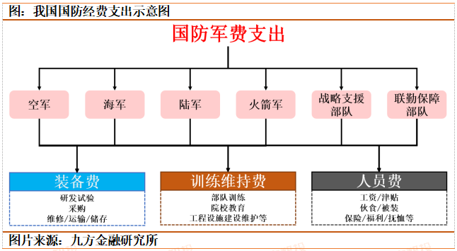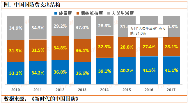 就方向而言,我国的国防经费支出有望继续维持结构稳定的表现。一般来说,国防军费的支出结构主要由三方面组成。往年数据显示,自2015年起,我国的国防经费支出在结构上后连续呈现出支出结构稳定的特征;装备费用(研发试验、采购、运输/维修/储存等)占比一直稳定在41%左右,是军费支出的最大部分。