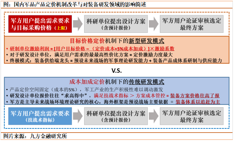 在产品定价方面,随着“目标价格法”的深化推进,我国军事装备的成本管控起点已经上移至装备设计阶段;我国装备费用的支出利用效率将得以从源头上获得提升,“价廉质优”的装备产品将是未来下游用户端与上游制造端共同追求的目标。