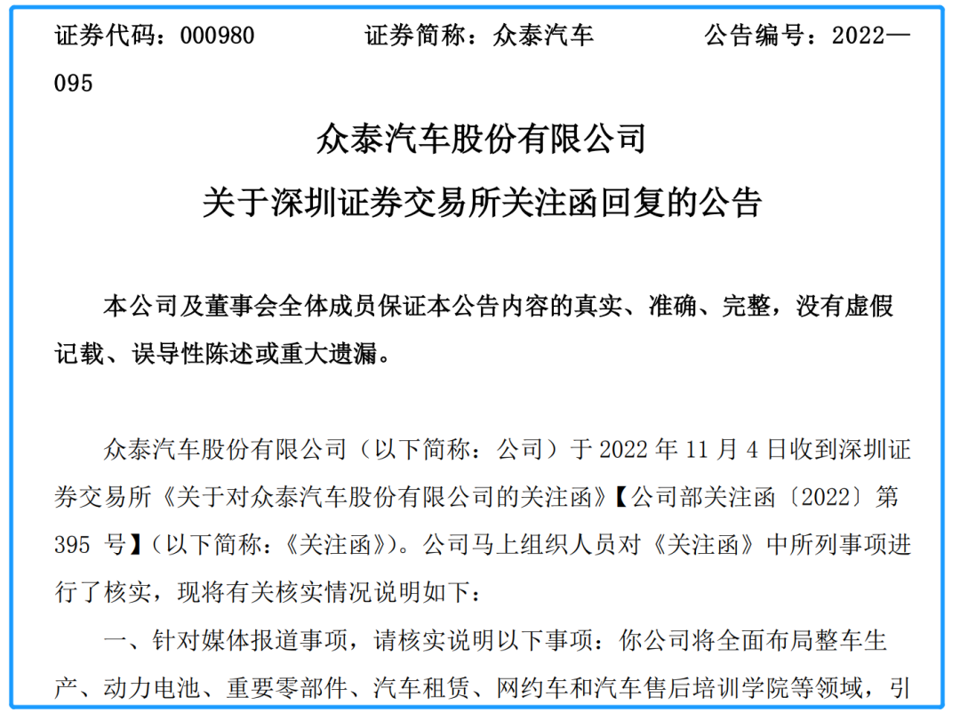 在关注函回复公告中,众泰汽车重申了未有引进先进动力电池技术并成立合资公司的事宜,也再次否认相关报道受访者为公司员工。