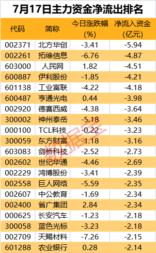 拓维信息今日再度大跌超6%,资金流出4.87亿元。此前因为3.56亿元担保未披露等违规事项,公司被责令改正。资金流出较高的还有人民网、伊利股份、工业富联,均超4亿元。