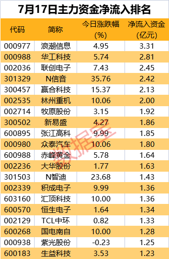 从个股看,两市仅有27股资金流入超亿元,其中浪潮信息、华工科技、联创电子等6股资金流入超2亿元。