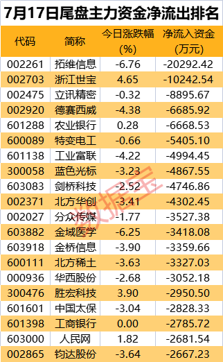 尾盘有15股流出资金超3000万元。拓维信息、浙江世宝分别流出超2亿元和1亿元。浙江世宝是线控转向概念的龙头,6月以来累计涨幅超130%。