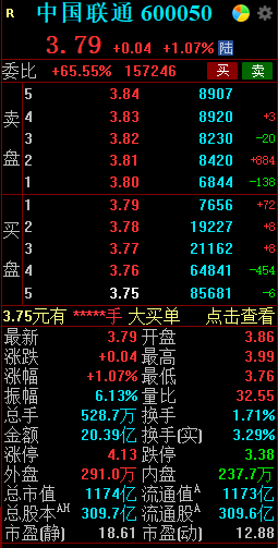 11月3日,中国联通大幅高开,截至发稿,该股涨幅收窄,涨逾1%,报3.79元,市值1174亿元。H股涨近4%。