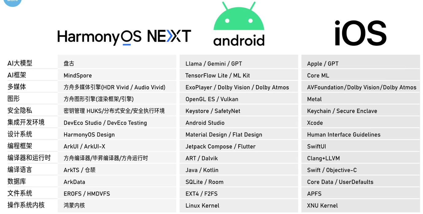 2024年三季度,伴随华为一系列主力新品的发布(目前看至少包括新一代旗舰手机Mate70系列、业界首款三折屏手机、甚至可能推出新一代算力卡昇腾910C),鸿蒙NEXT也将正式发布。最新的鸿蒙NEXT从操作系统内核、文件系统,到编程语言、编译器/运行时、编程框架,再到设计系统、集成开发环境,以及AI框架和大模型等,实现了全栈自研,完全砍掉了传统的AOSP(安卓开放源代码项目)代码,系统的流畅度、能效、安全性得到大幅提升。