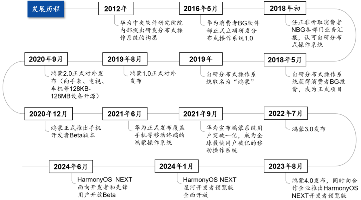 2019年,华为正式发布基于谷歌“开源安卓(AOSP)”内核的鸿蒙系统1.0版本。随后几年,鸿蒙持续更新。至2023年8月,华为发布鸿蒙4.0,并宣布鸿蒙终端设备已超过7亿台,开发者超过220万。同期,华为发布下一代鸿蒙系统Harmony:NEXT,下一代鸿蒙系统将与安卓实现“硬分叉”——这意味着,未来的鸿蒙系统不再兼容安卓程序,大家熟悉的“.apk”后缀的程序将无法安装,鸿蒙将启用全新的软件生态。
