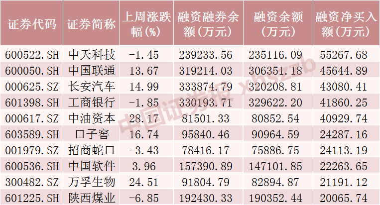 从个股情况来看,上周融资客加仓居前的10只股票分别为中天科技、中国联通、长安汽车、工商银行、中油资本、口子窖、招商蛇口、中国软件、万孚生物、陕西煤业,分别获净买入5.53亿元、4.56亿元、4.31亿元、4.19亿元、4.09亿元、2.43亿元、2.41亿元、2.23亿元、2.12亿元、2.01亿元。从市场表现看,这10只股票中,除中天科技、工商银行、招商蛇口、陕西煤业上周分别累计下跌1.45%、1.85%、3.43%、6.85%外,其他股票均上涨,其中中油资本、万孚生物均涨超24%。值得注意的是,上周融资客加仓超4亿元的中油资本今日涨停。