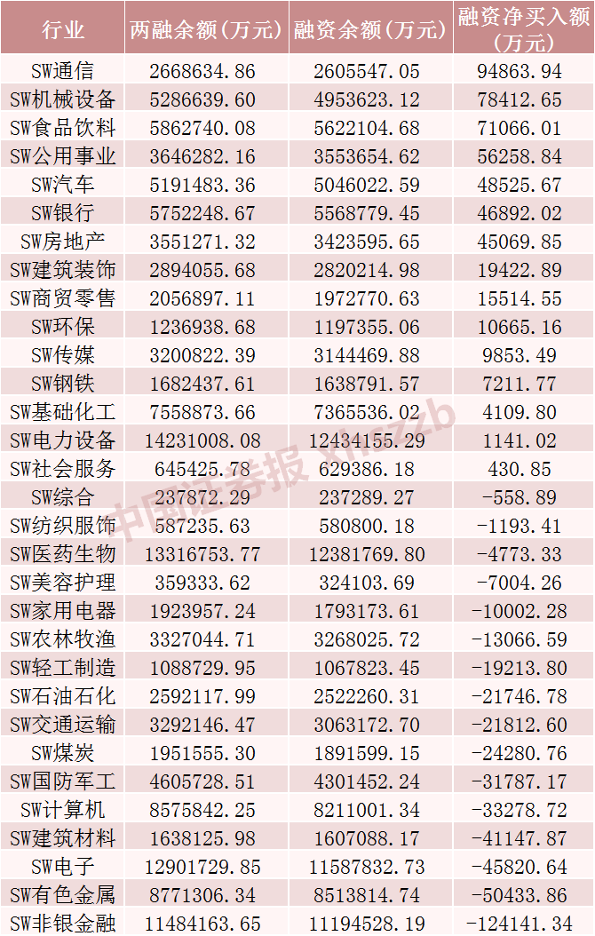 从行业情况来看,上周申万一级行业中有15个行业融资余额增加,通信、机械设备、食品饮料行业融资余额增加居前,分别增加9.49亿元、7.84亿元、7.11亿元;非银金融、有色金属、电子行业融资净卖出金额居前,分别净卖出12.41亿元、5.04亿元、4.58亿元。