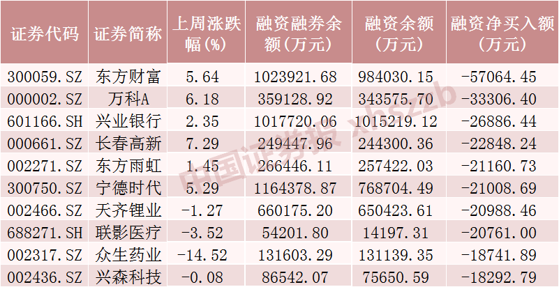 上周融资客减仓居前的10只股票分别为东方财富、万科A、兴业银行、长春高新、东方雨虹、宁德时代、天齐锂业、联影医疗、众生药业、兴森科技,分别净卖出5.71亿元、3.33亿元、2.69亿元、2.28亿元、2.12亿元、2.10亿元、2.10亿元、2.08亿元、1.87亿元、1.83亿元。从市场表现看,这10只股票涨多跌少,涨幅最大的长春高新上周涨逾7%,跌幅最大的众生药业跌逾14%。