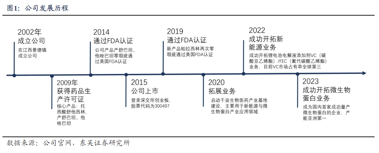 抗感染原料药起家,微生物蛋白、新能源业务驱动新增长江西富祥药业股份有限公司成立于2002年,2009年获得药品生产许可证,2015年登陆创业板。公司主营业务为β-内酰胺酶抑制剂和碳青霉烯类(培南系列)原料药,自2020年开始,公司布局千亩生物医药产业基地,业务向微生物合成蛋白质和锂电池电解液添加剂VC(碳酸亚乙烯酯)/FEC(氟代碳酸乙烯酯)延伸,2022年起已实现量产并带来收入,有望成为公司新增长点。公司产品包括舒巴坦系列、他唑巴坦系列等β-内酰胺酶抑制剂原料药,培南系列等高端抗生素产品,亦包括2022年上市的锂电池电解液添加剂VC/FEC和2023年上市的微生物蛋白产品,总体而言公司是一家面向下游制剂、新能源电解液、食品生产厂商的基础原材料企业。