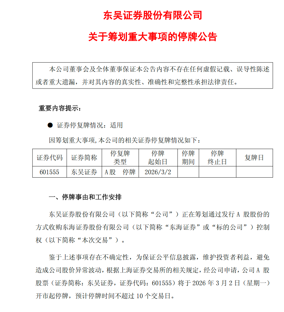 3月2日盘前,东吴证券发布公告,公司正在筹划通过发行A股股份的方式收购东海证券控制权,即拟通过发行股份的方式购买东海证券控股股东常投集团持有的东海证券26.68%股权,公司A股股票开市起停牌,预计停牌时间不超过10个交易日。