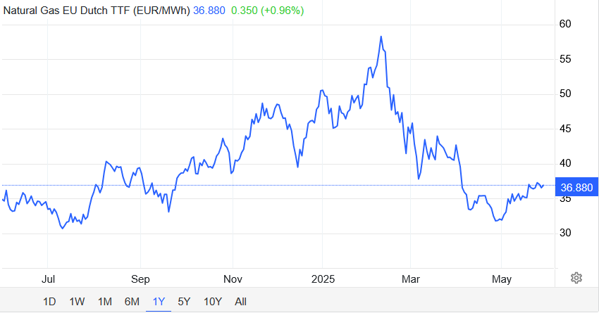 欧洲天然气价格周四小幅走高,原因是人们猜测美国法院叫停美国总统特朗普关税措施可能会提振能源需求。截至发稿,基准荷兰TTF天然气6月期货价格涨近1%,报36.88欧元/兆瓦时。