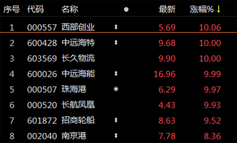 航运概念股继续走强。截至发稿,中远海特、中远海能等多股涨停,珠海港、长航凤凰、招商轮船等个股纷纷跟涨。