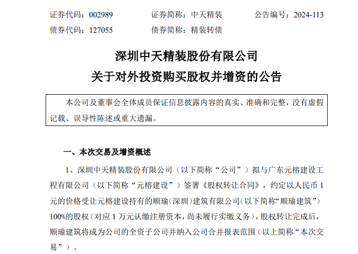 12月4日晚间,中天精装(002989)发布公告,拟与广东元榕建设工程有限公司(以下简称“元榕建设”)签署《股权转让合同》,约定以1元的价格受让元榕建设持有的顺瑜(深圳)建筑有限公司(以下简称“顺瑜建筑”)100%的股权。